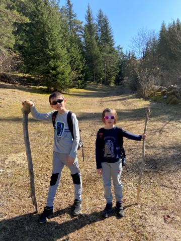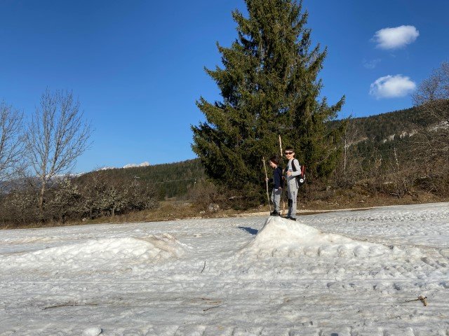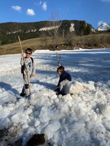 Dans la descente, glissades sur le peu de neige qui reste sur la piste des Rambins.