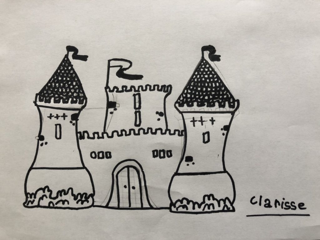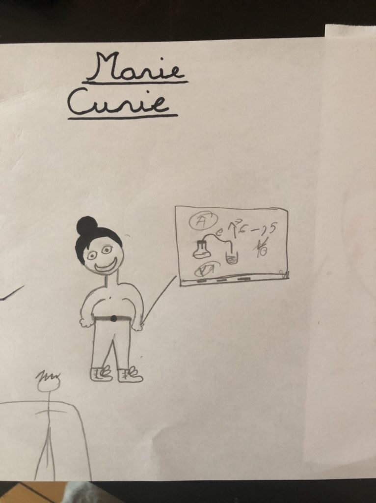 Clarisse devait dessiner un château fort pour la maîtresse, elle s’est aidée d’un tuto sur internet pour le réaliser. Le deuxième dessin, elle l’a fait en écoutant le potcast des Odyssées sur Marie Curie.