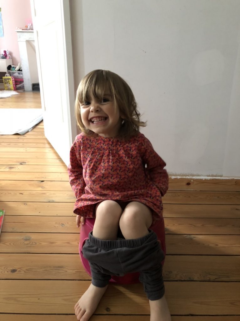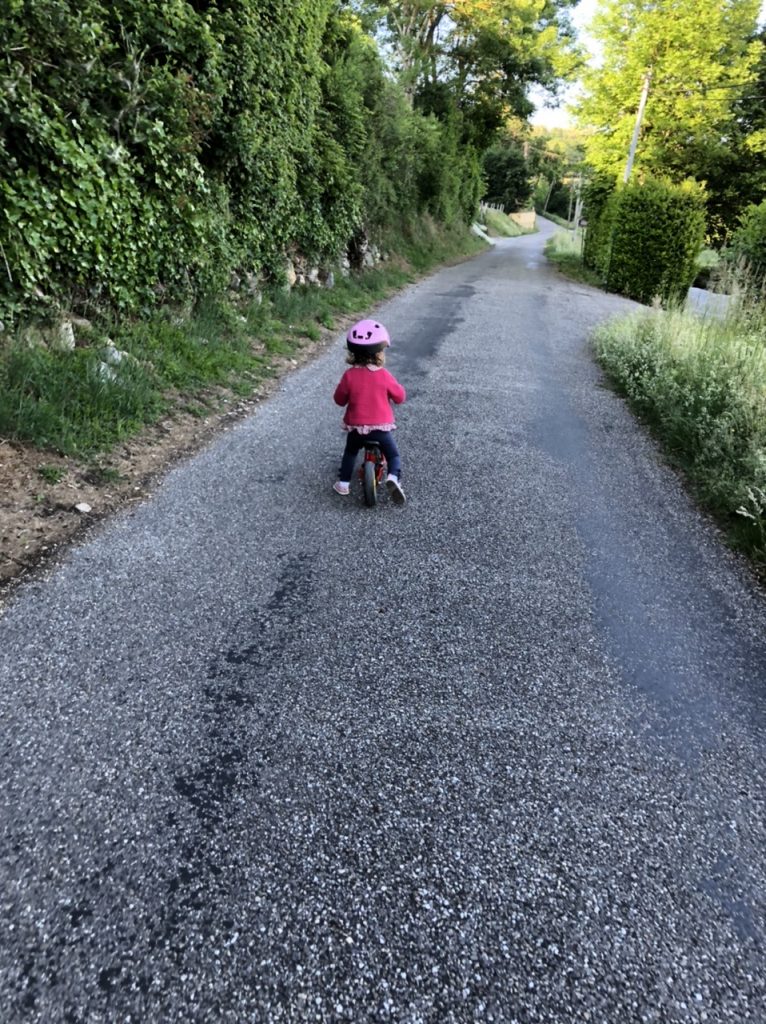Soline prend de l’assurance sur sa draisienne. Elle reste de plus en plus sur le pot mais sans trop de résultat pour le moment.