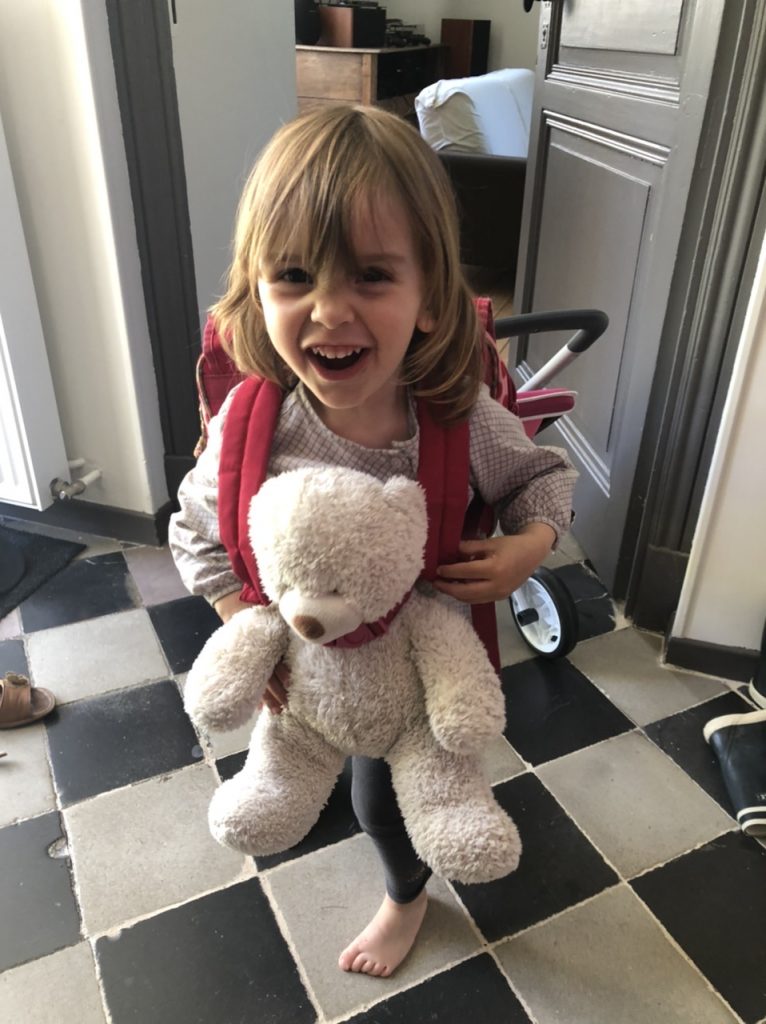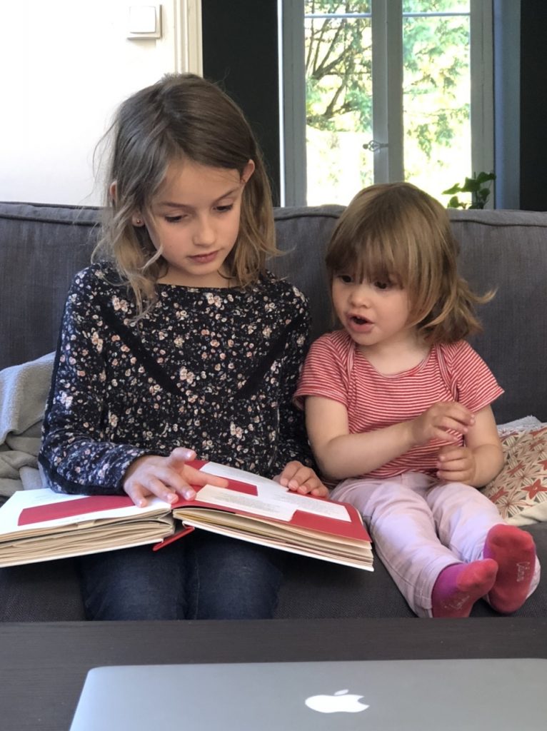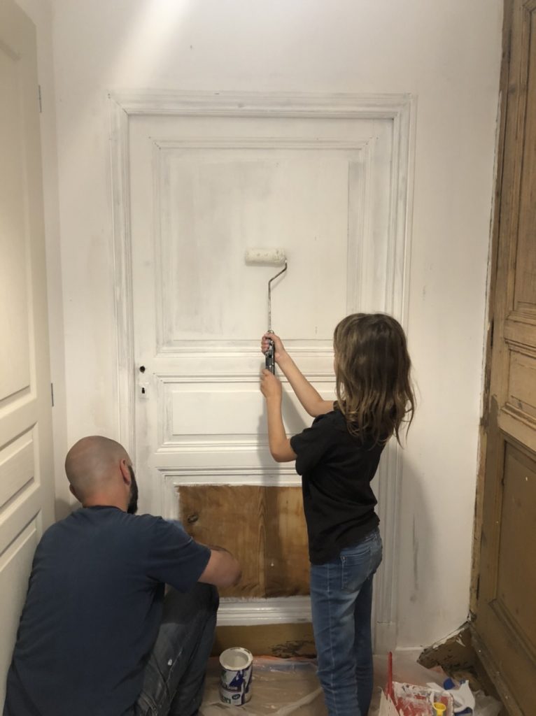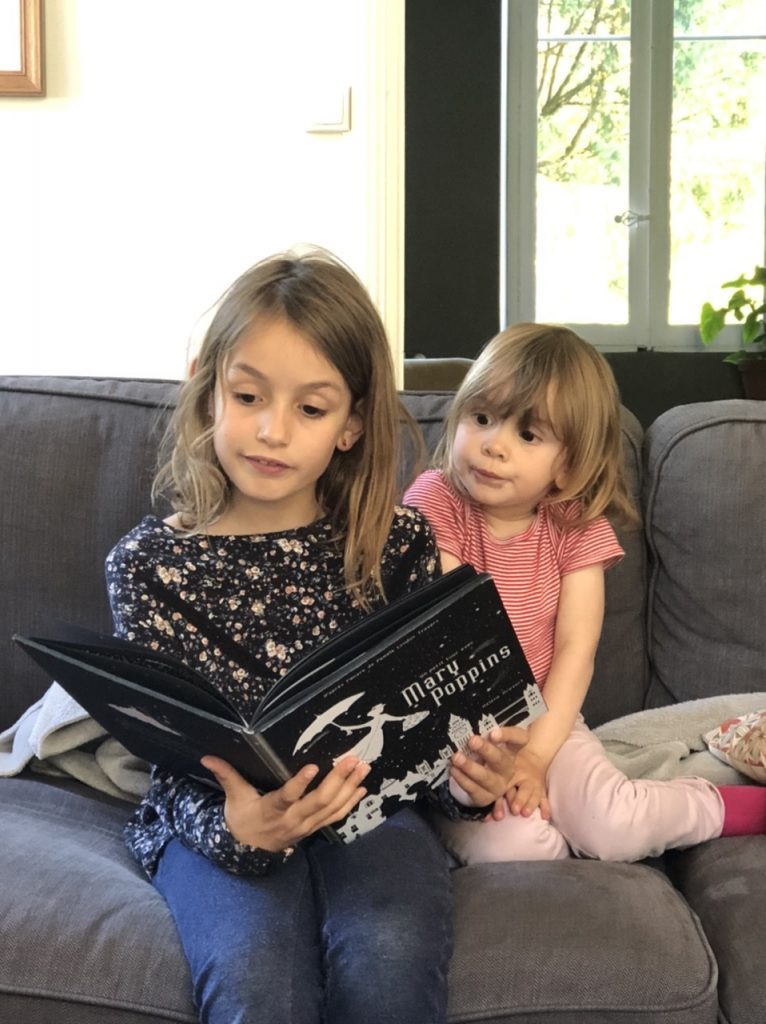 Petit temps de lecture entre sœur.Soline a inventé un porte doudou ! Elle est très fière : « t’as vu maman, t’as vu ! »Ce week-end, Clarisse donne un coup de main pour la première couche de peinture.