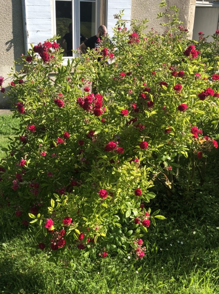 Notre rosier fleuri et penche de plus en plus sous le poids des fleurs.
