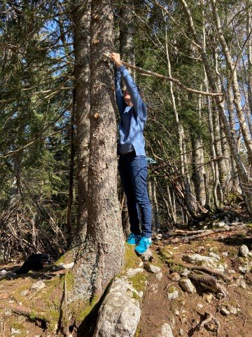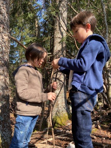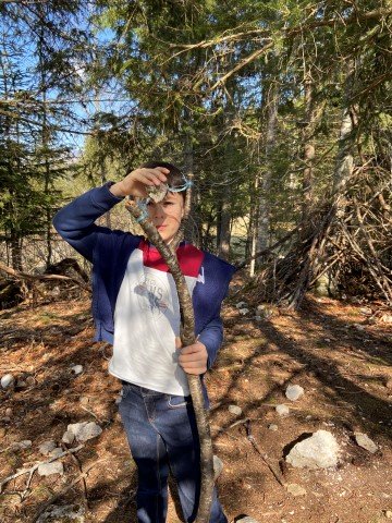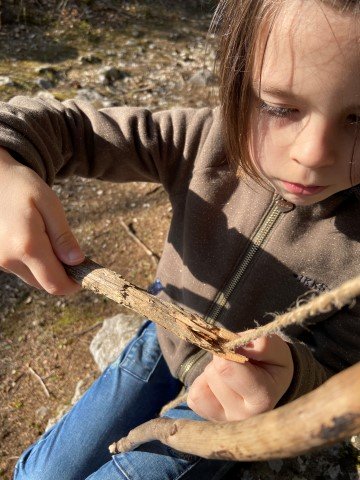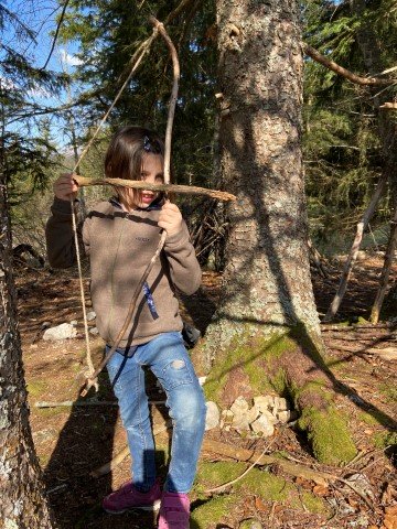 Fabrication d’un arc et d’un lance-pierres avec les bois et ficelles trouvés sur place.